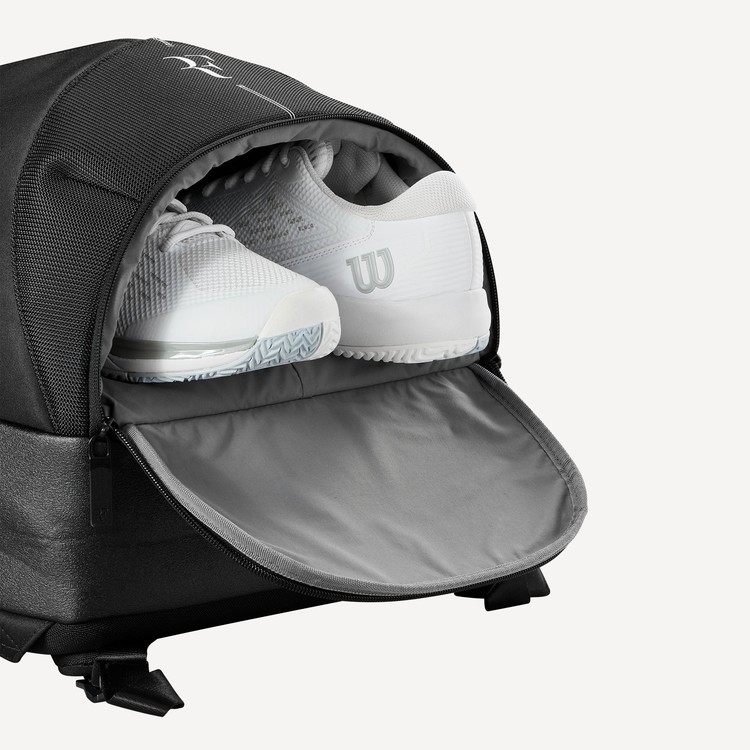 Wilson RF 테니스 백팩은 로저 페더러의 도움을 받아 디자인되었습니다. 이 백팩은 등에 메고 경기장으로 라켓과 장비를 휴대할 수 있는 충분한 공간을 갖춘 가방을 찾는 선수들을 위해 제작되었습니다. RF 백팩은 부분 라켓 수납칸을 통해 최대 두 개의 테니스 라켓을 수납할 수 있습니다. 또한, 별도의 신발 수납칸, 노트북 수납칸, 그리고 여러 개의 지퍼가 달린 부속품 포켓을 갖추고 있습니다.